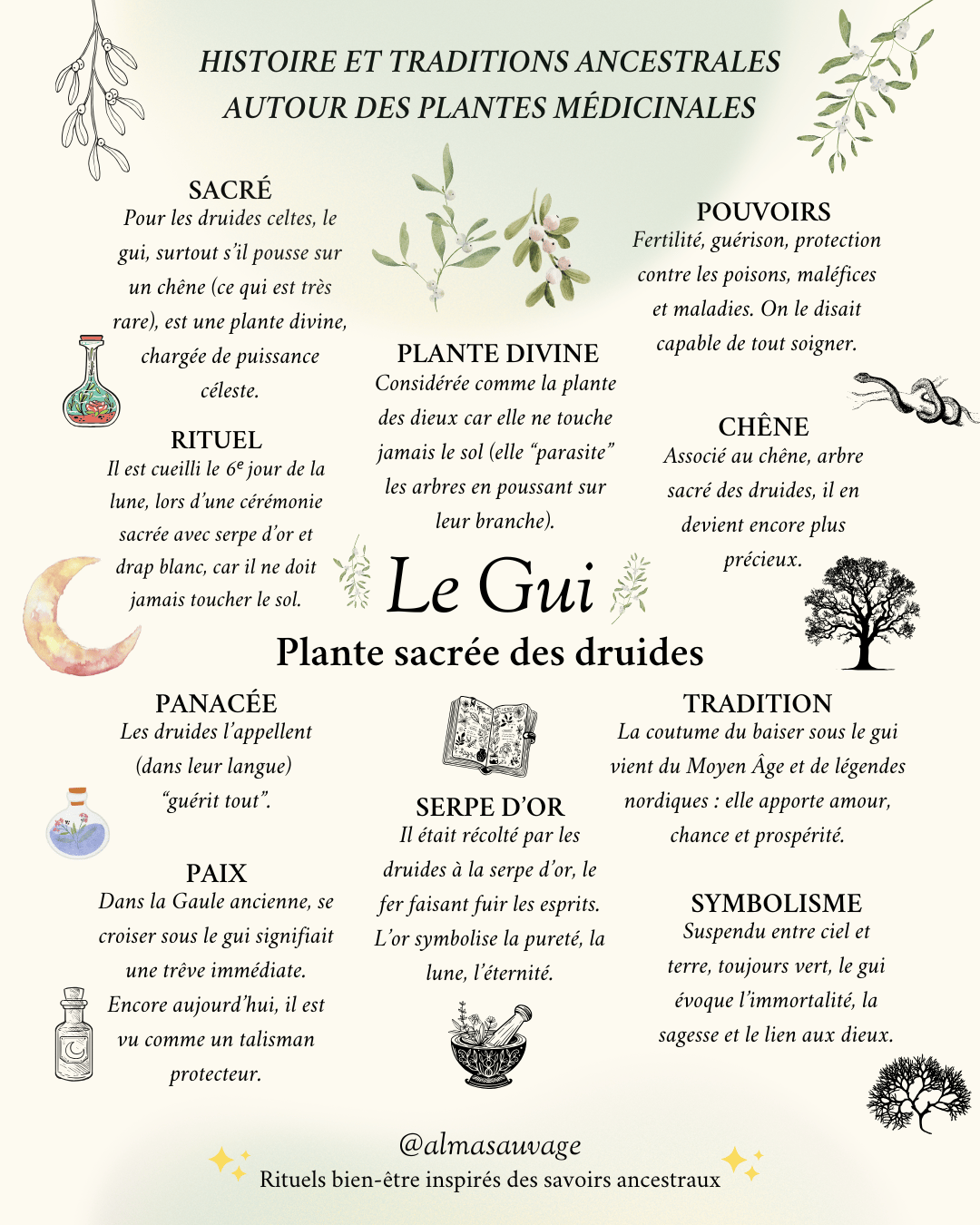 Les druides la considéraient comme une émanation céleste, un don des dieux. Sa cueillette était entourée d’un rituel précis : le sixième jour de la lune, un druide grimpait dans l’arbre pour en détacher les rameaux avec une serpe d’or. Le gui ne devait jamais toucher terre, afin de conserver ses pouvoirs. On le recueillait dans un tissu blanc, avant de le déposer dans une coupe remplie d’eau pour obtenir une eau sacrée aux vertus curatives.