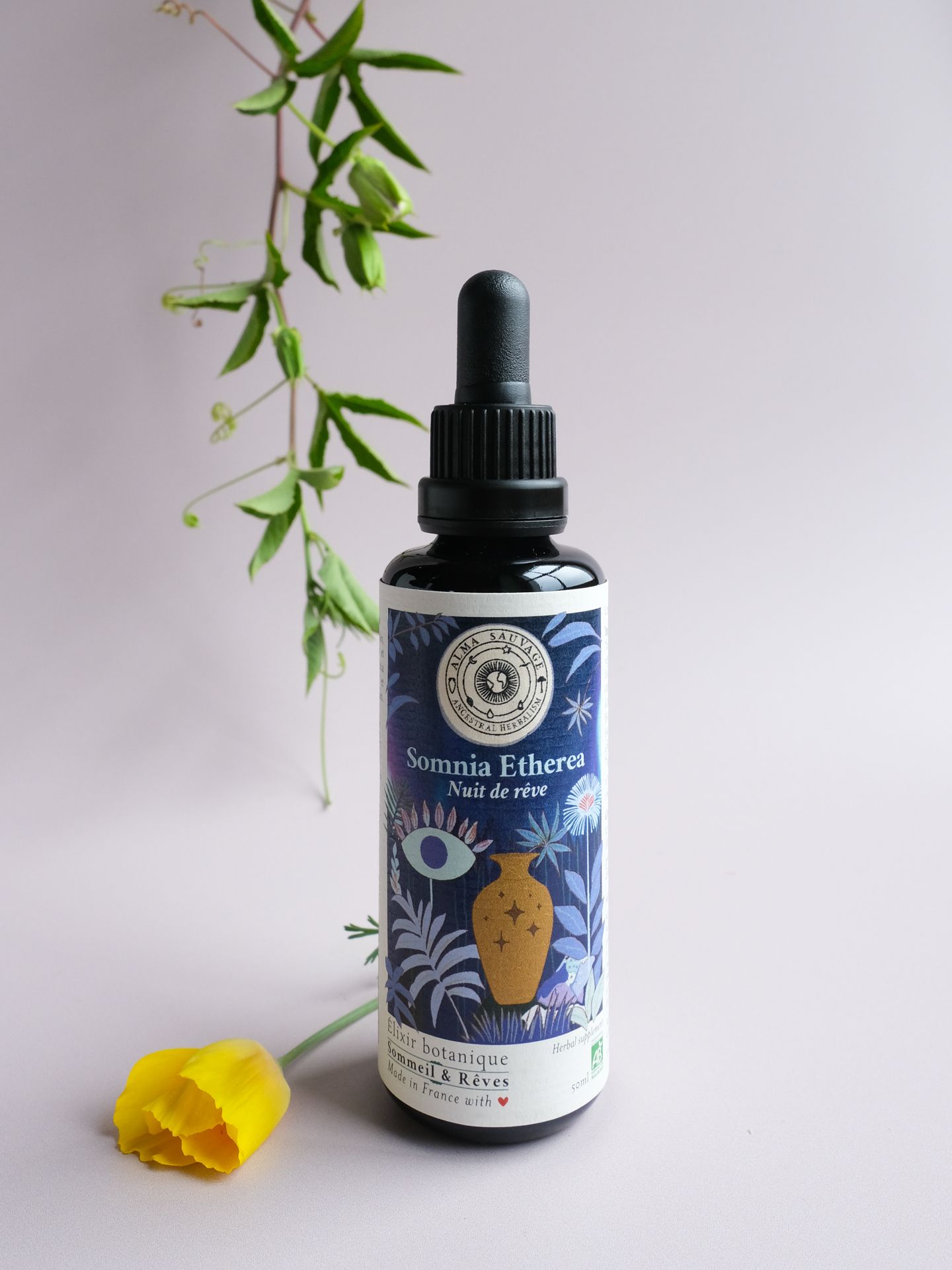 Somnia Etherea, élixir pour des nuits de rêve. Adieu difficultés d’endormissement, réveils nocturnes et nuits sans repos. Bonjour nuits réparatrices et rêves merveilleux, grâce à une synergie unique de 6 plantes médicinales que nous cultivons à la main en totale harmonie avec la nature.